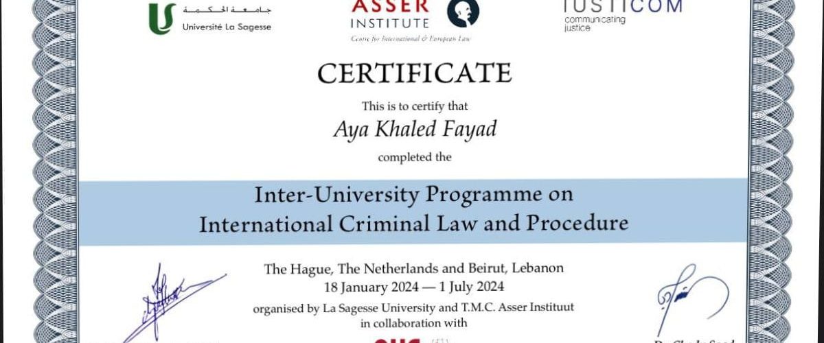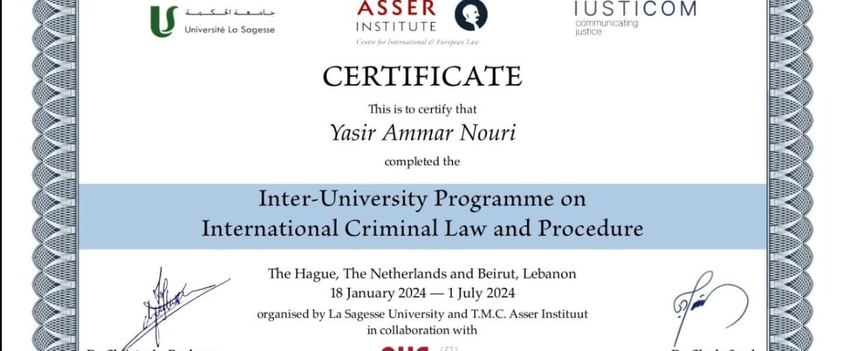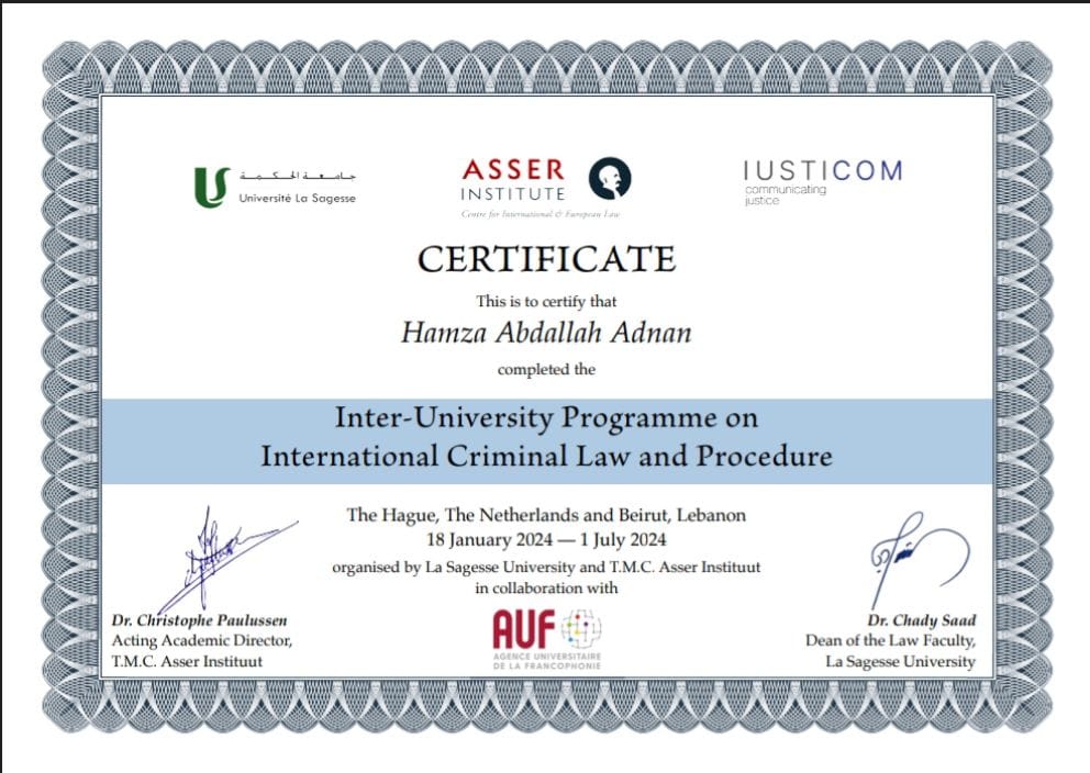 اجتاز طلبة كلية القانون في جامعتنا الامتحان في الدورة التدريبية في القانون الجنائي الدولي والاجراءات الجنائية الدولية المنعقدة من قبل جامعة الحكمة في لبنان وبالتعاون مع الوكالة الفرانكفونية والمدرجة اسمائهم ادناه ، وقد تم منحهم شهادة تدريبية في القانون الجنائي الدولي/ موضوع قضية الابادة الجماعية.