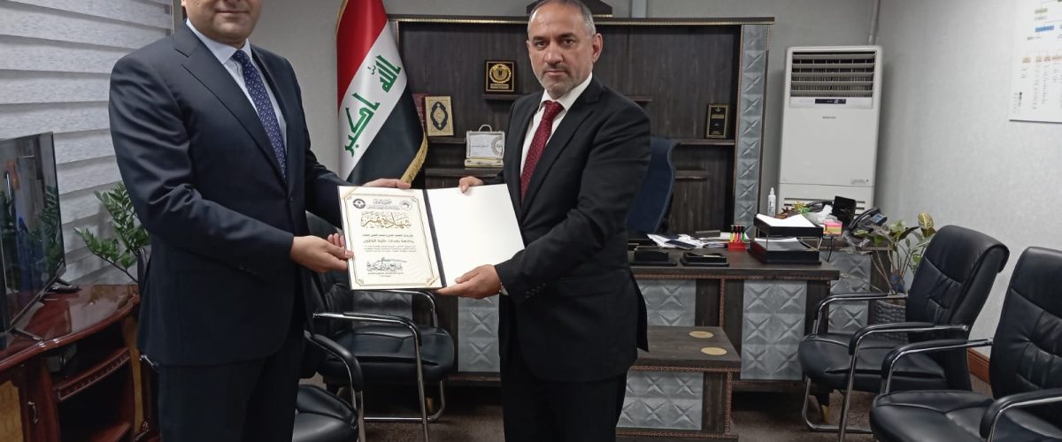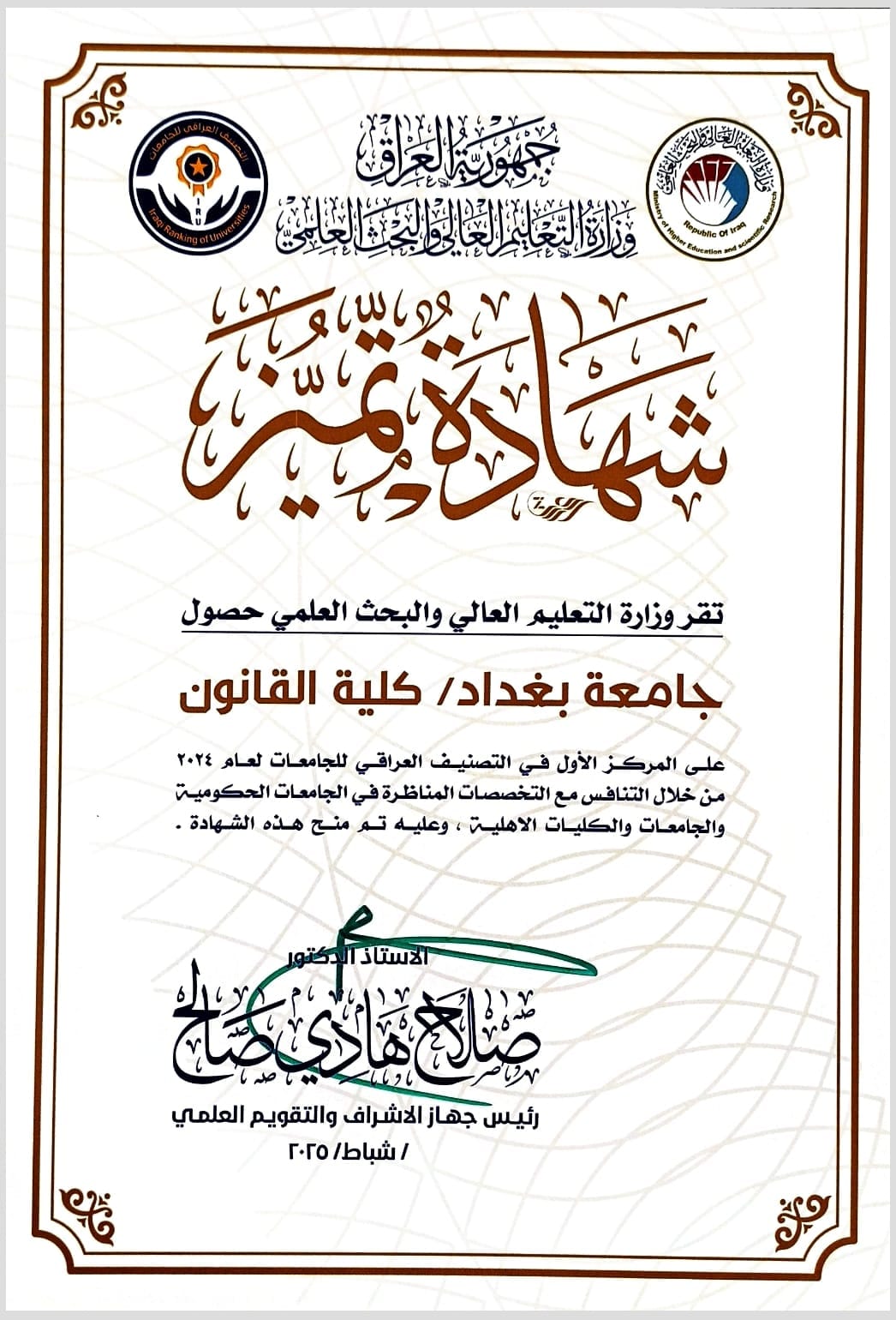 وسلّم رئيس جهاز الإشراف والتقويم العلمي، الأستاذ الدكتور صلاح هادي صالح، شهادة التميّز إلى عميد الكلية، الأستاذ الدكتور علي هادي عطية، خلال مراسم رسمية أُقيمت في مبنى وزارة التعليم العالي، صباح يوم الأربعاء الموافق 9 نيسان 2025، بحضور عدد من الشخصيات الأكاديمية والإدارية.