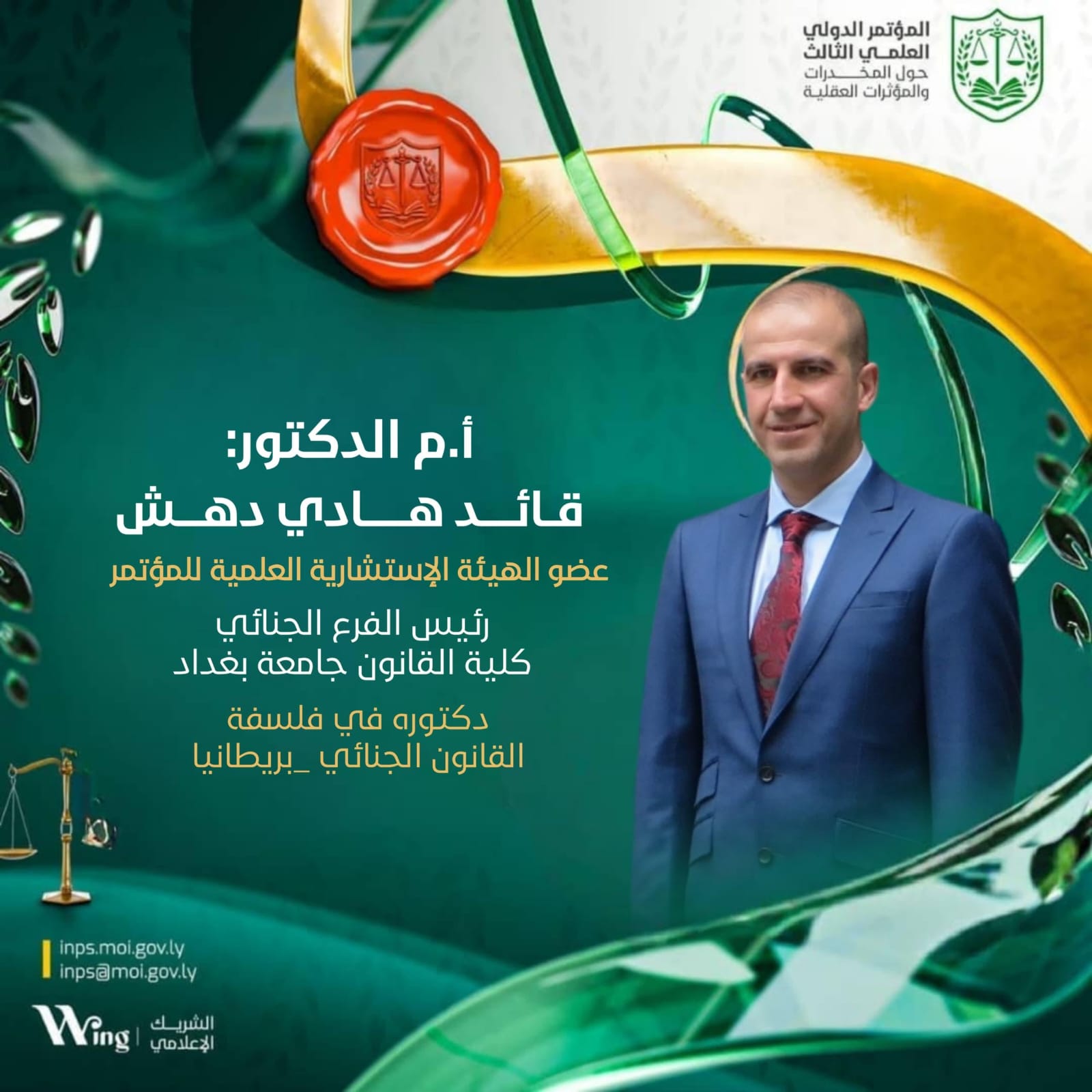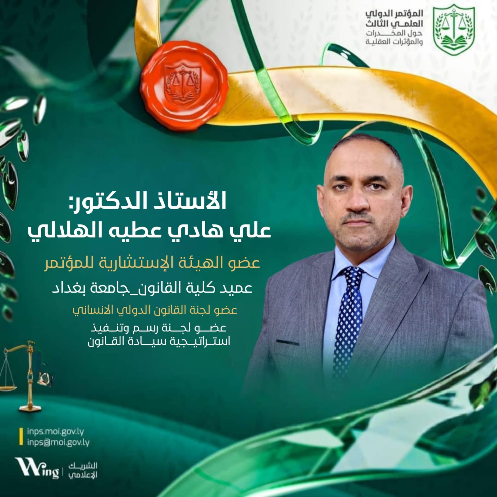 في إطار التعاون العلمي الدولي، تم اختيار الأستاذ الدكتور علي هادي عطية الهلالي، عميد كلية القانون – جامعة بغداد، عضواً في الهيئة الاستشارية، والأستاذ المساعد الدكتور قائد هادي دهش، رئيس الفرع الجنائي في الكلية، عضواً في الهيئة الاستشارية العلمية للمؤتمر العلمي الدولي الثالث حول المخدرات والمؤثرات العقلية: واقع المواجهة التشريعية والقضائية والأمنية لإشكالياتها، الذي يُعقد في العاصمة الليبية طرابلس للفترة من 25 إلى 28 تشرين الثاني 2025، تحت شعار: