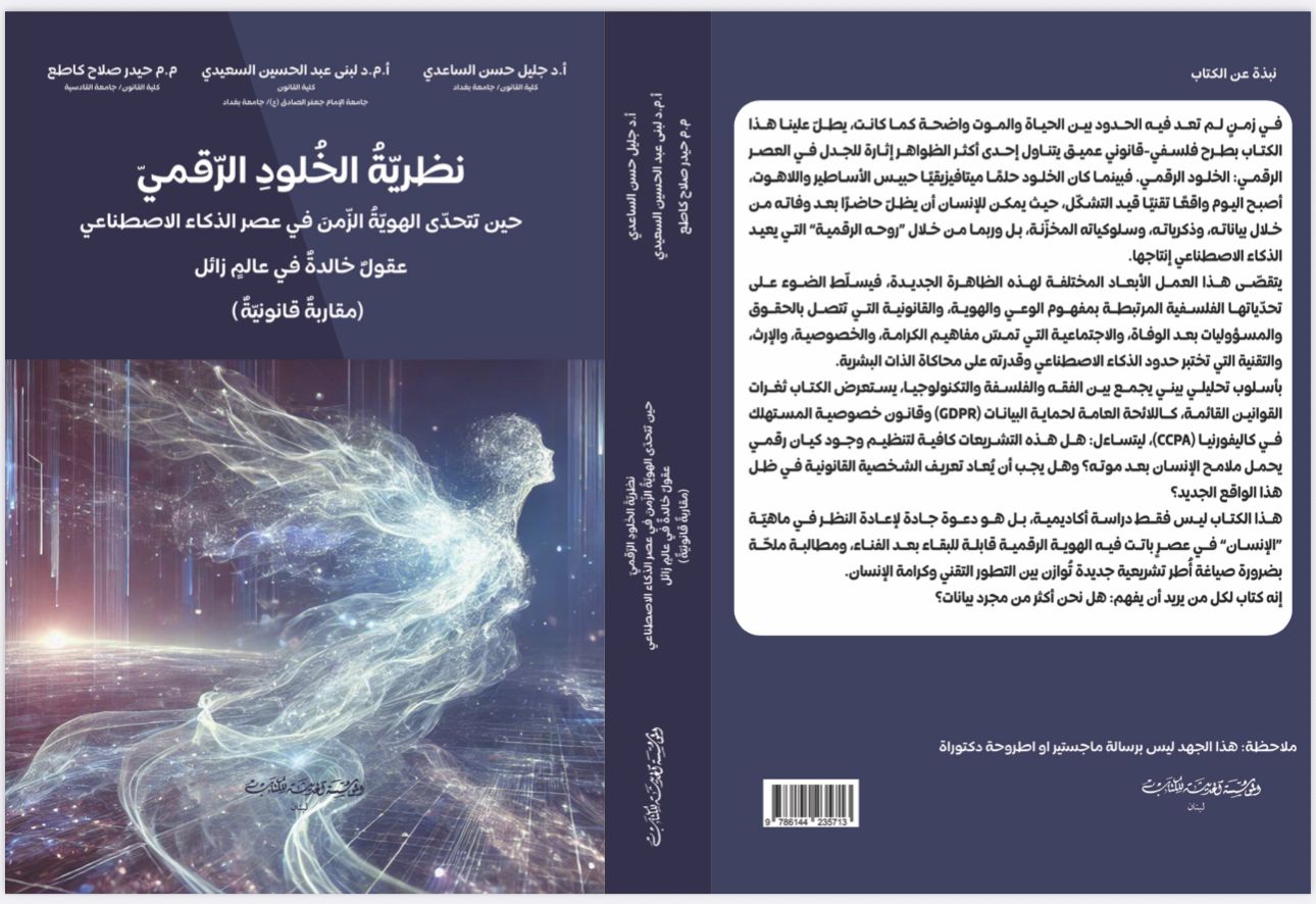 في اطار الجهود العلمية التي تهدف الى خدمة المجتمع ومواكبة احدث المستجدات في العلوم القانونية صدر مؤخرا مؤلف علمي جديد بعنوان (نظرية الخلود الرقمي حين تتحدى الهوية الزمن في عصر الذكاء الاصطناعي عقول خالدة في عالم زائل – مقاربة قانونية) وهو تأليف مشترك بين الاستاذ الدكتور جليل حسن الساعدي المعاون العلمي في كلية القانون/ جامعة بغداد والاستاذ المساعد الدكتور لبنى عبد الحسين السعيدي والمدرس المساعد حيدر صلاح كاطع.
