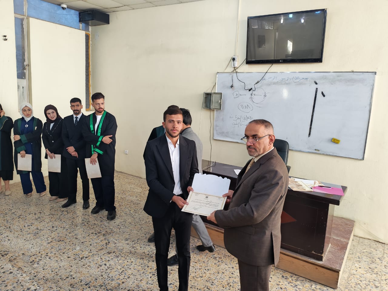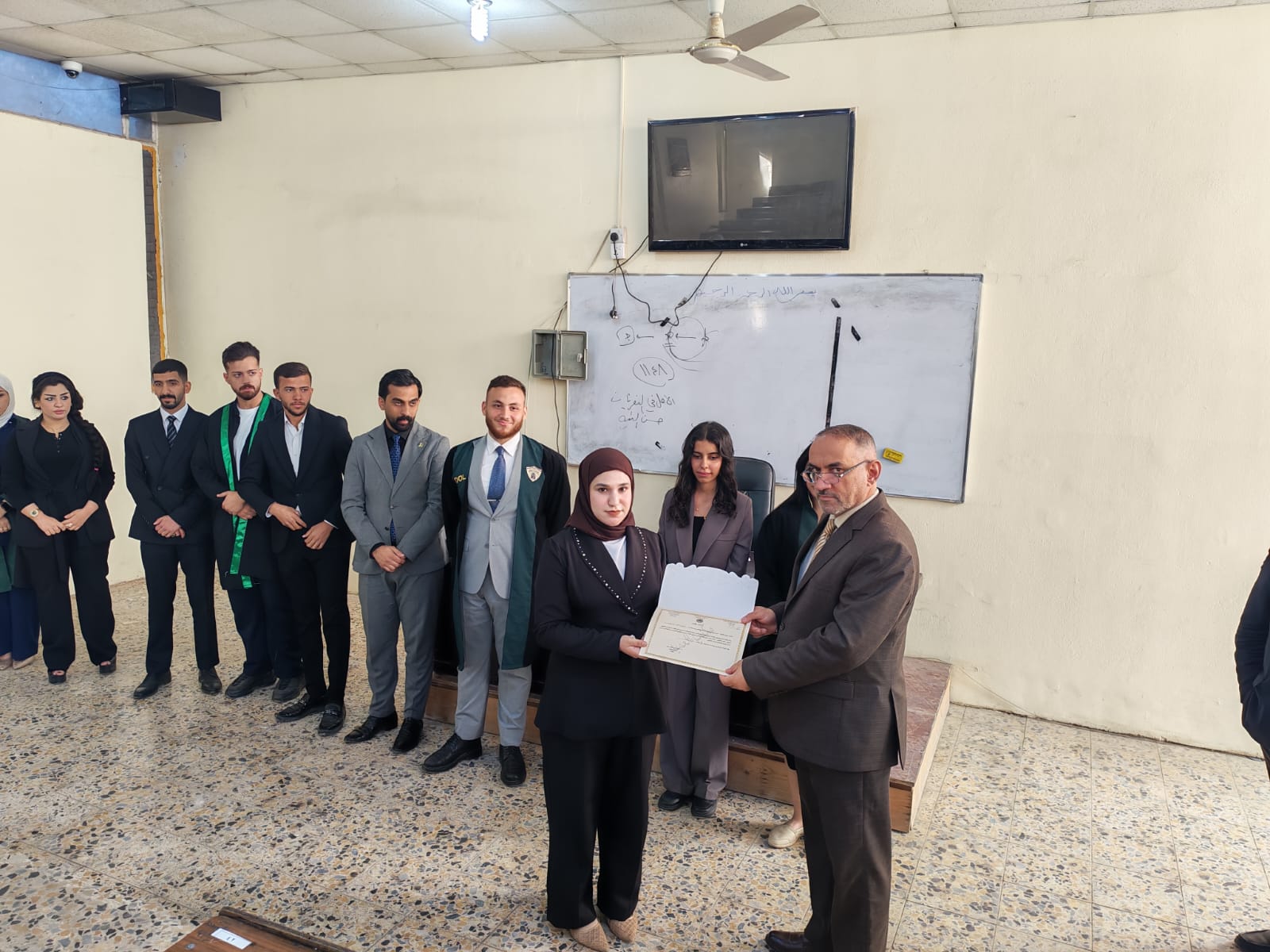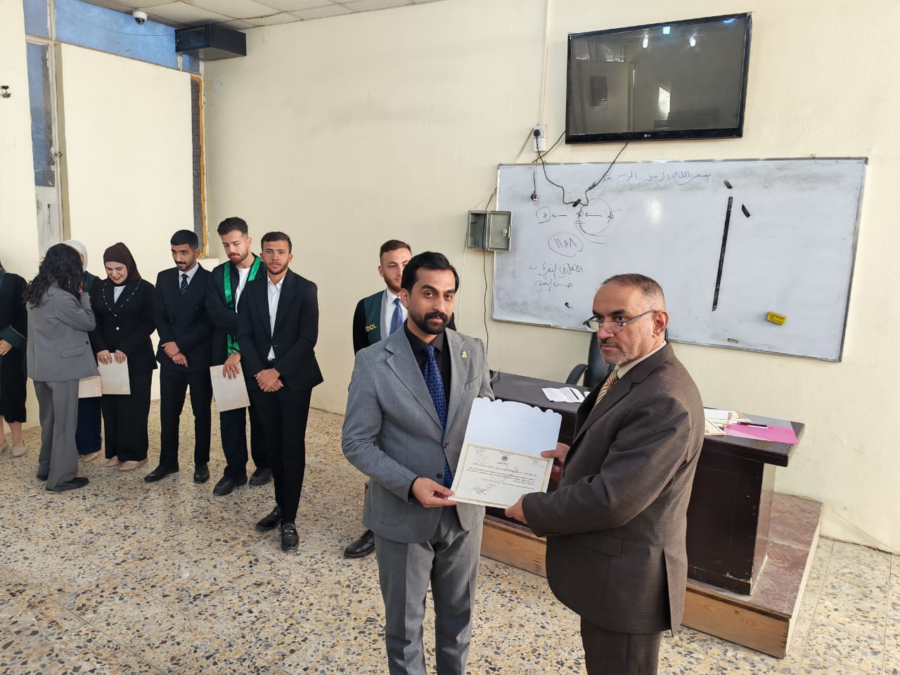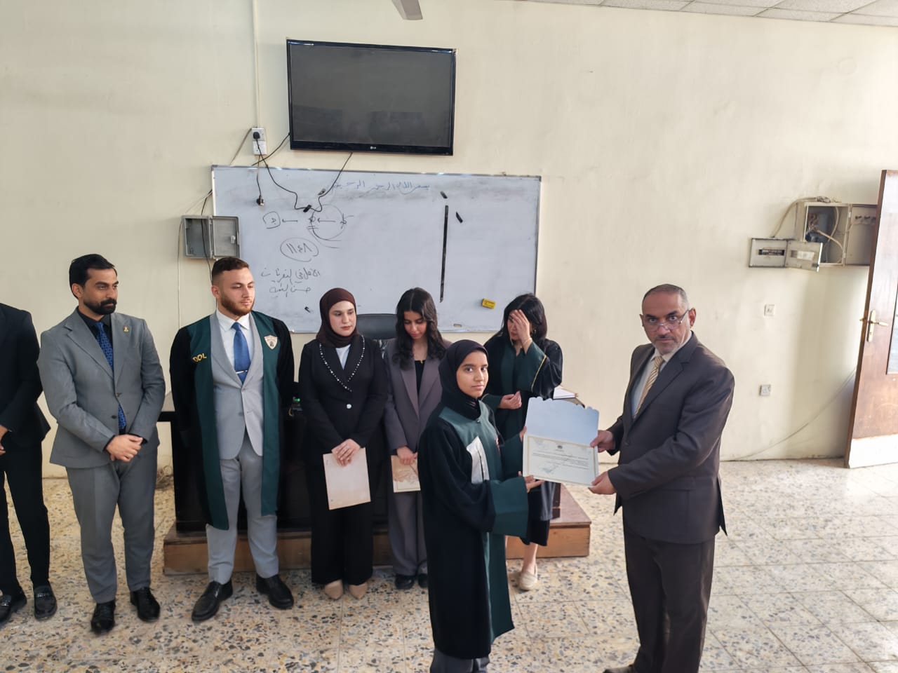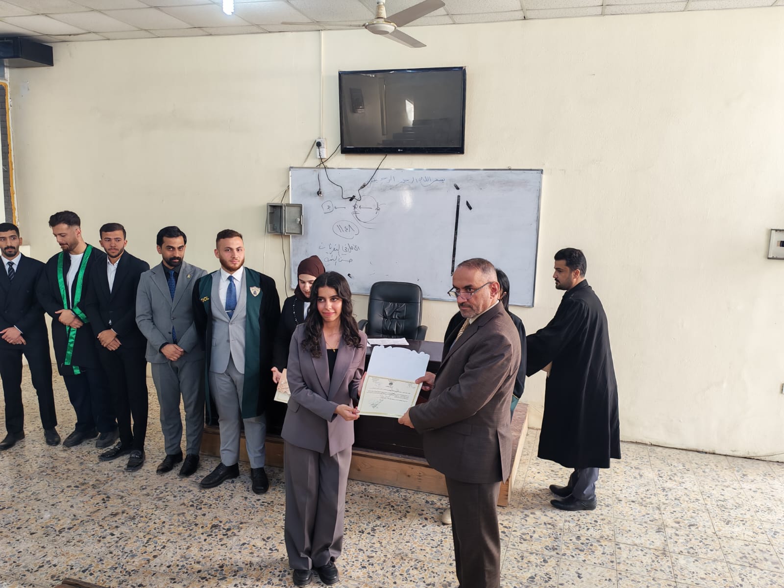 برعاية السيد عميد كلية القانون الأستاذ الدكتور علي هادي عطية المحترم، جرى تكريم نخبة من الطلبة المتميّزين المشاركين في مسابقة المحكمة الصورية التي تناولت موضوع الجنسية وتنازع القوانين، وذلك تقديرًا لأدائهم العلمي والمهاري المتميز خلال مختلف مراحل المسابقة.