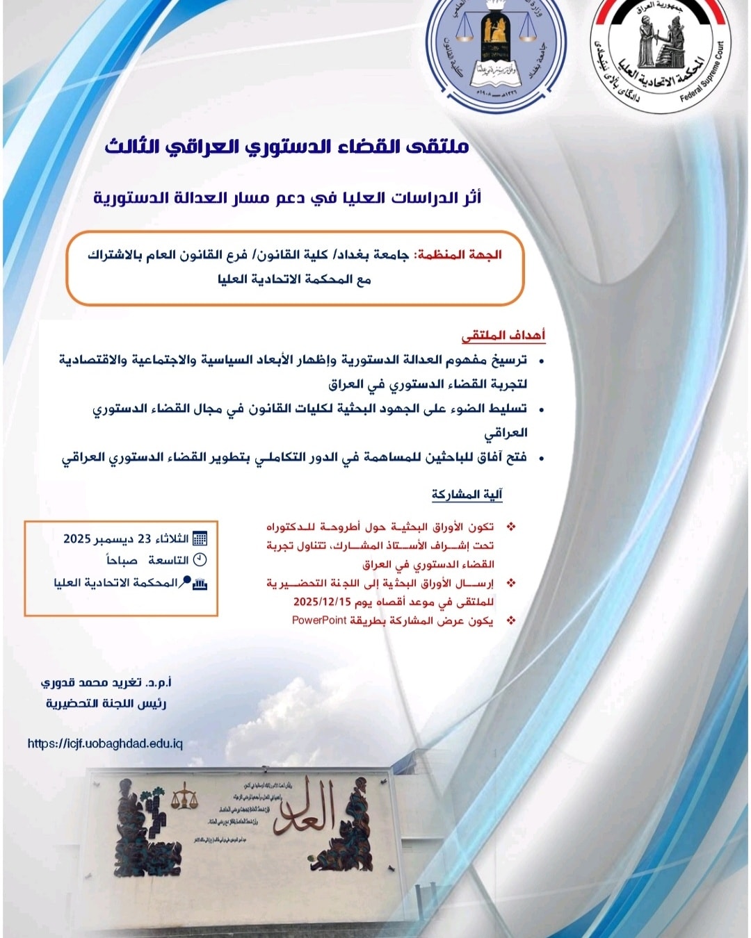 تستعد كلية القانون في جامعة بغداد لإطلاق أعمال الملتقى العراقي الثالث للقضاء الدستوري، الذي تنظمه بالإشتراك مع المحكمة الاتحادية العليا يوم الثلاثاء الموافق 23 كانون الأول 2025، في مقر المحكمة الاتحادية العليا ببغداد، عند الساعة التاسعة صباحًا.